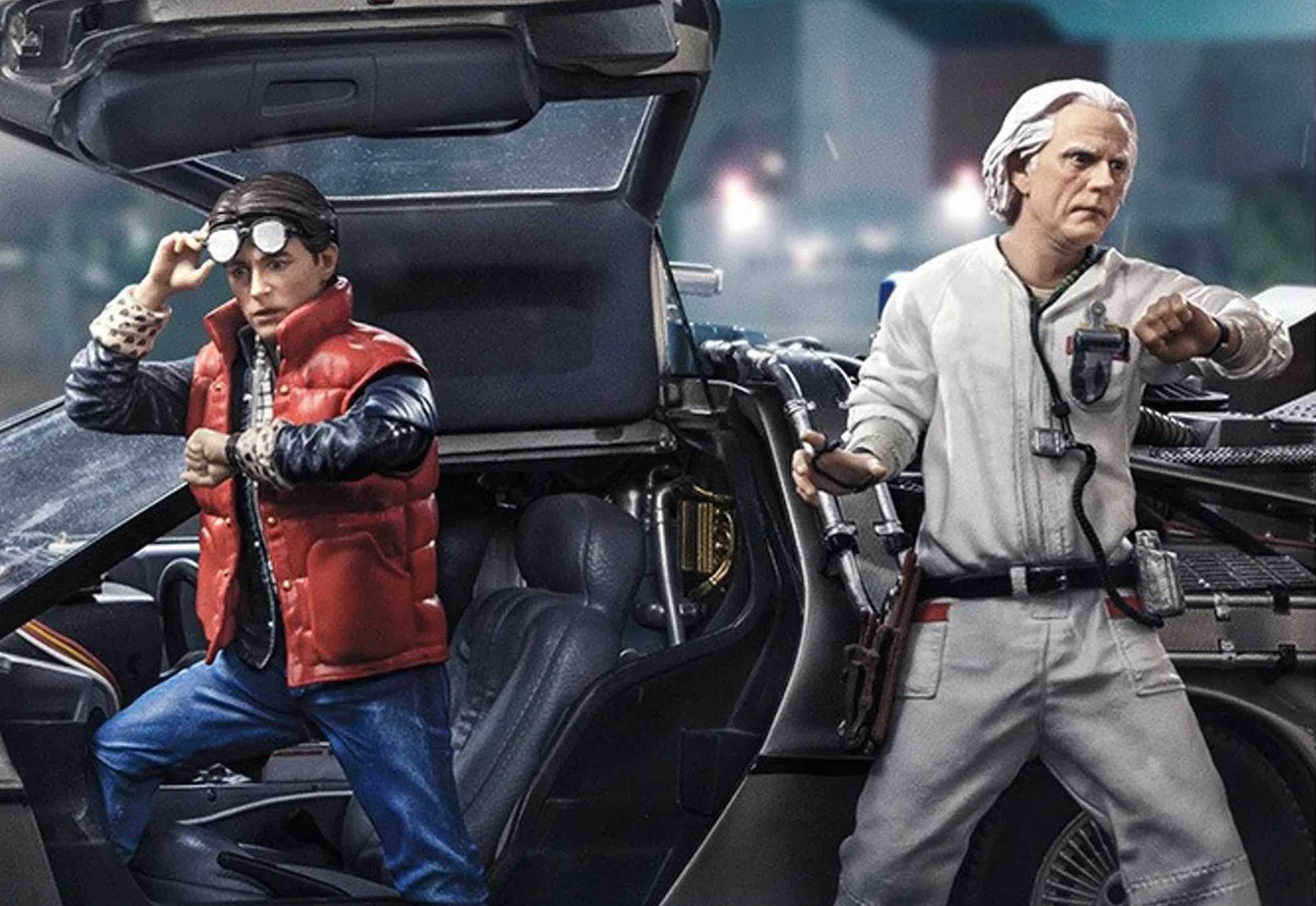 Marty McFly stands alongside his pal, the quirky physicist Emmett Doc Brown, and his furry companion, a Catalan sheepdog dubbed Einstein (only available in the DeLorean Full Set Deluxe), poised for a legendary journey through time in one of cinema’s most iconic time machines — the plutonium-powered DeLorean.