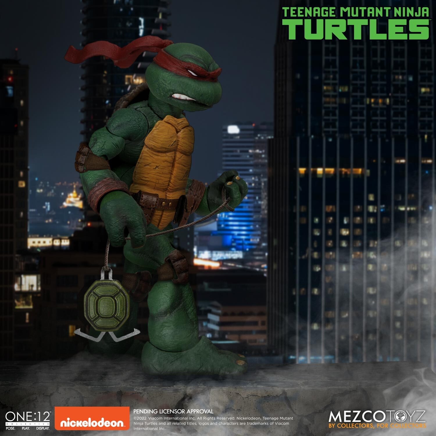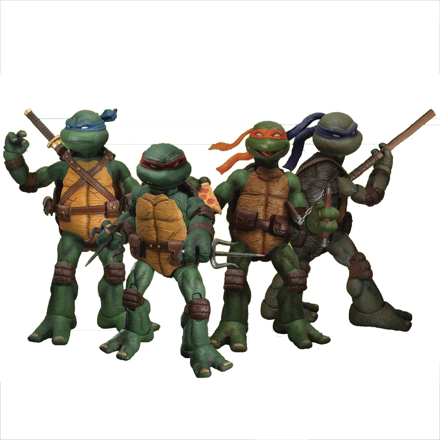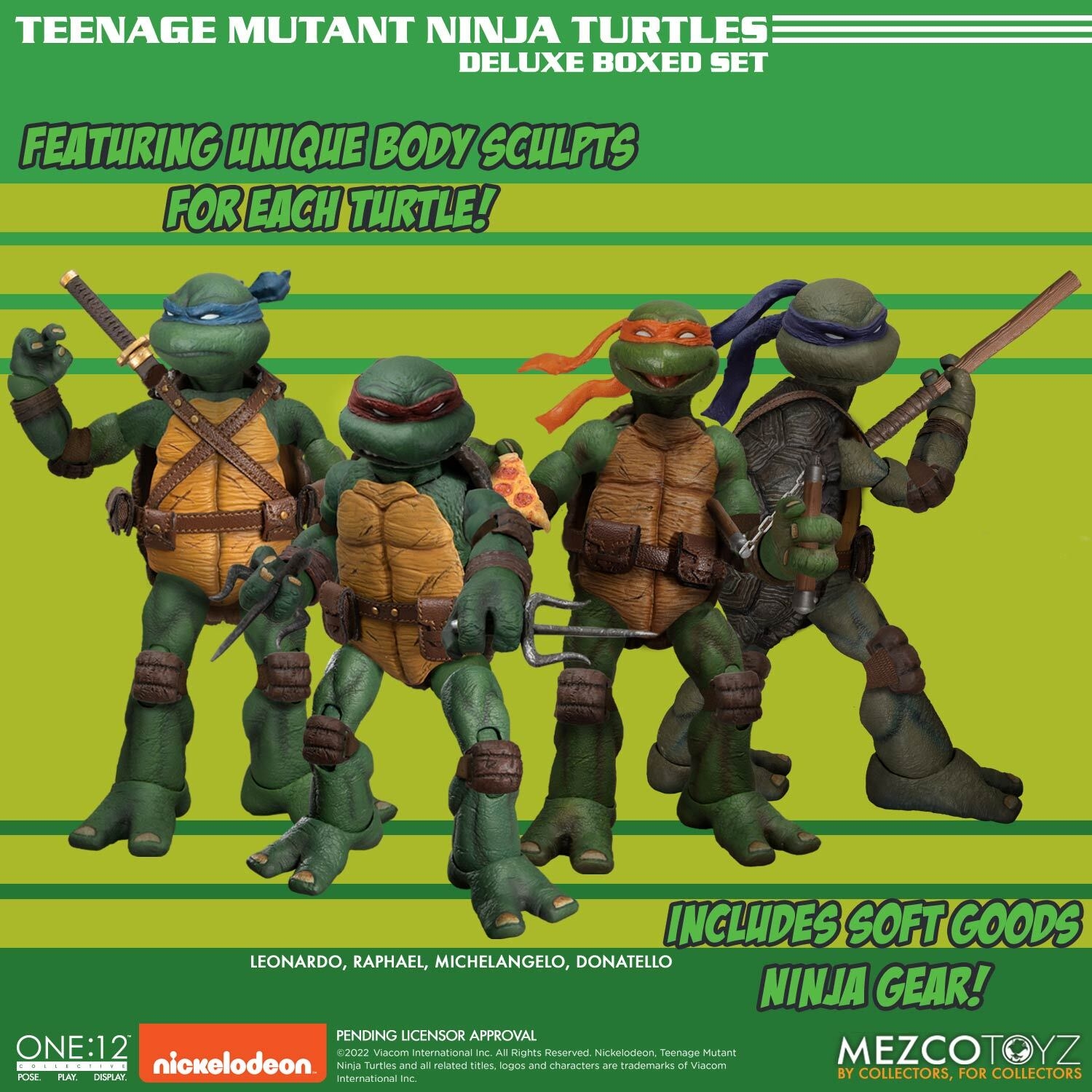 From Mezco Toys. Emerging from the sewers of New York City, the Teenage Mutant Ninja Turtles join the One:12 Collective! They’re lean, they’re green AND they’re mean! This deluxe boxed set can barely contain Leonardo, Raphael, Donatello, Michelangelo, their interchange head portraits in varying expressions, fabric gear, and their massive assemblage of accessories! All-new sculpts create 4 unique turtle body types! The TMNT each wear their respective, interchangeable colored masks and include real soft good utility belts and harnesses that can hold their signature weapons. Students of ninjitsu, the Turtles prepare to take down Shredder and the Foot CLAN, equipped with an arsenal of ninja weapons like shuriken, sai, kunai, katanas, tonfas, push dagger, and a bo staff. If that wasn’t enough, they include additional alternative cloth goods and more! The One:12 Collective Teenage Mutant Ninja Turtles Deluxe Boxed Set is packaged in a collector-friendly box, designed with collectors in mind.